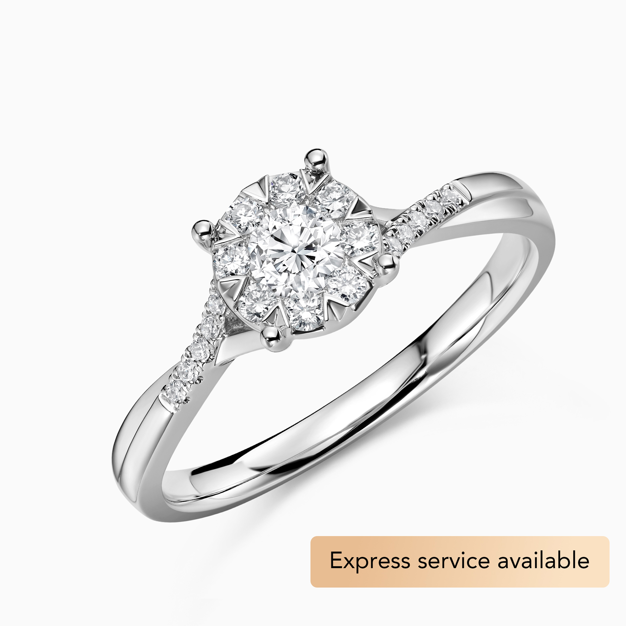 This brilliantly designed round halo bypass engagement ring, has eight smaller diamonds encircling the round-cut center stone to create a dazzling halo. It features a gorgeous twisted band design with 12 closely-set sparkling diamonds. The DR Believe engagement ring series draws its inspiration from the first snowfall of winter, with no two snowflakes alike, much like the unique nature of each couple’s true love.