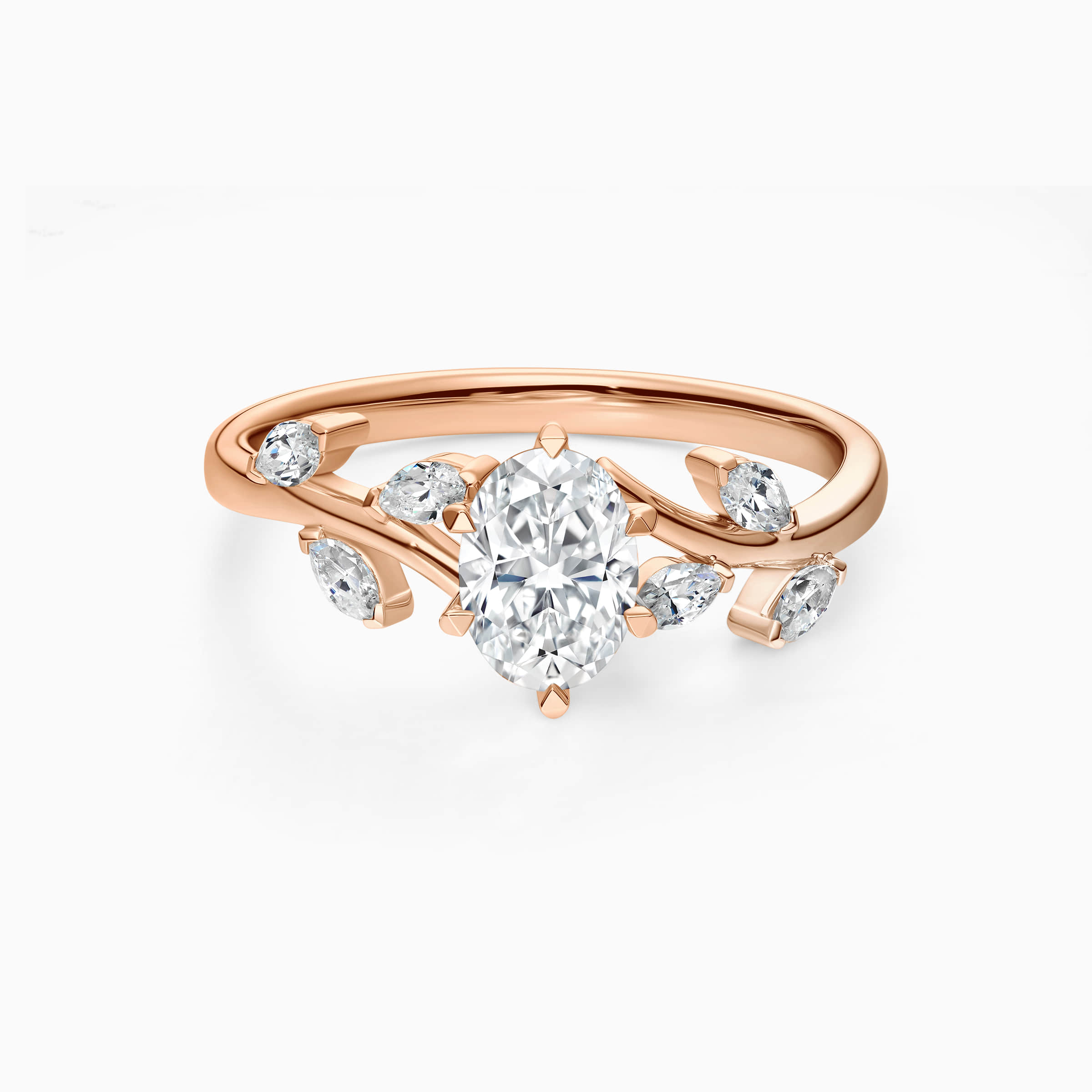 An emblem of perfect love, this exquisite unique bypass engagement ring merges classic and modern elements. Its oval-shaped diamond centerpiece radiates brilliance, set within six prongs. Twisting vine-like leaf motifs on the band symbolize enduring love's vitality. This ring exudes mystery and romance, captivating with its allure.