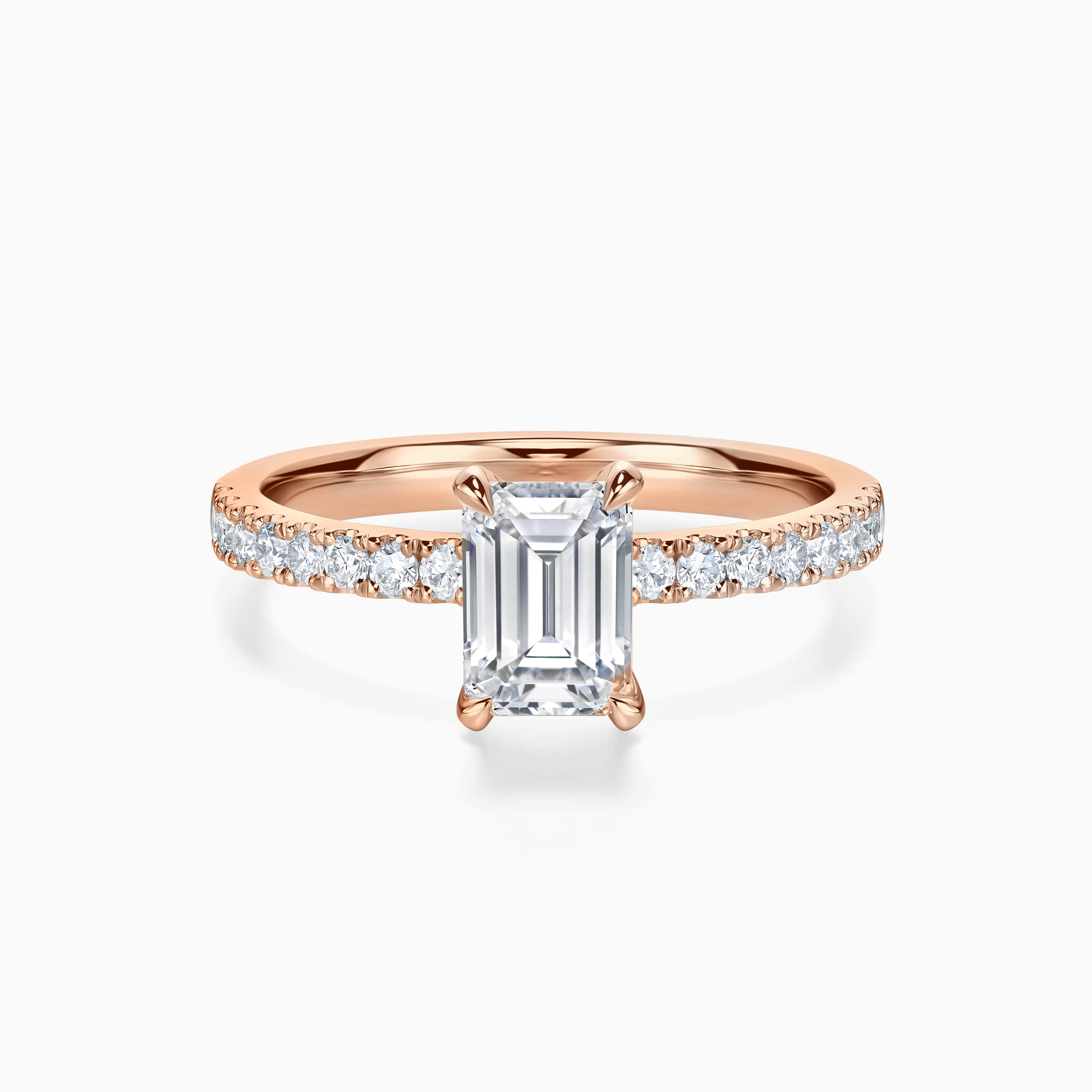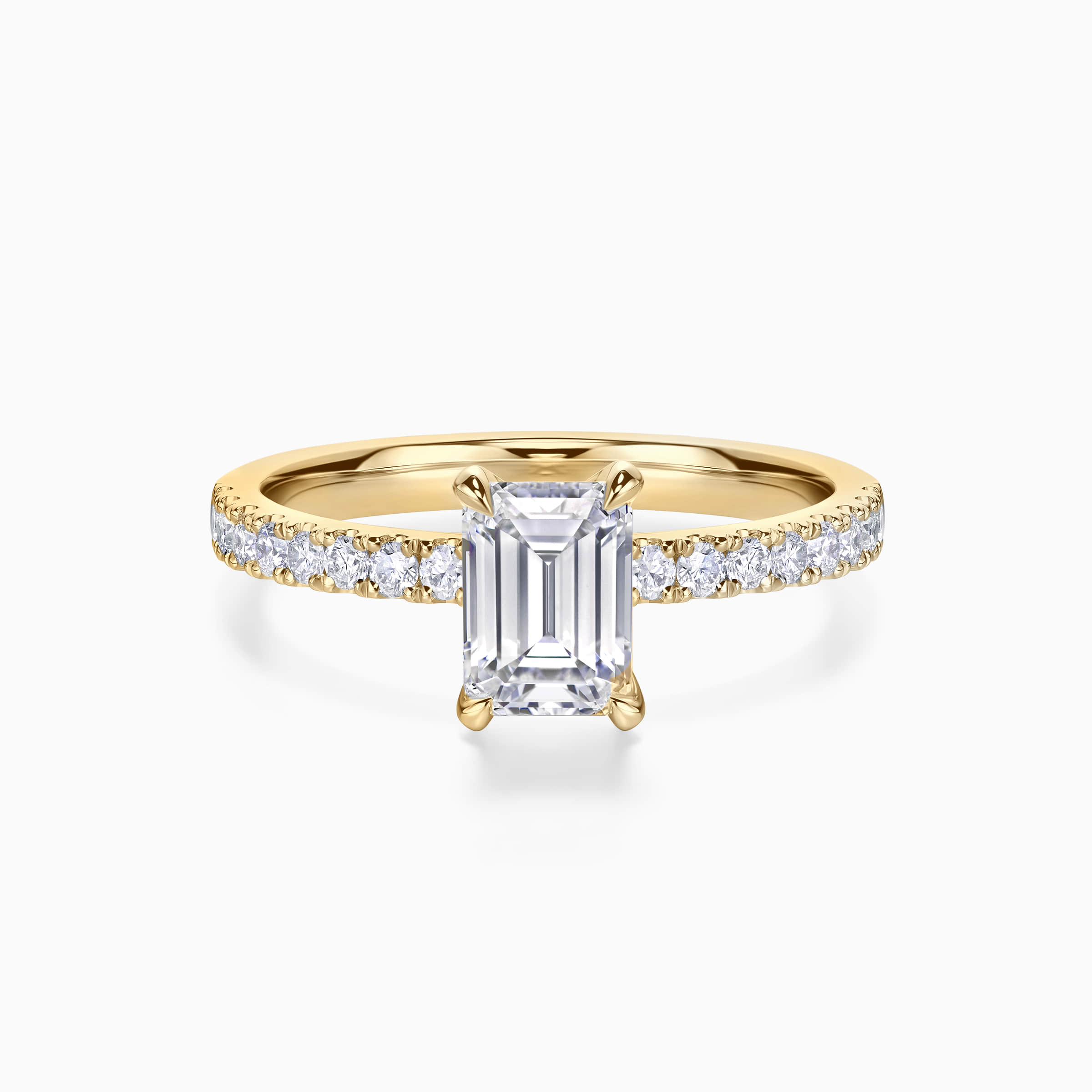 Celebrate your "One Life, One Love" story with the DR Engagement Ring, featuring a mesmerizing emerald-cut diamond at its heart, embodying enduring elegance. Cradled by sparkling pavé-set diamonds, it symbolizes everlasting commitment in this unique custom creation, reminding you that with Darry Ring, your love is as unique as the ring itself.