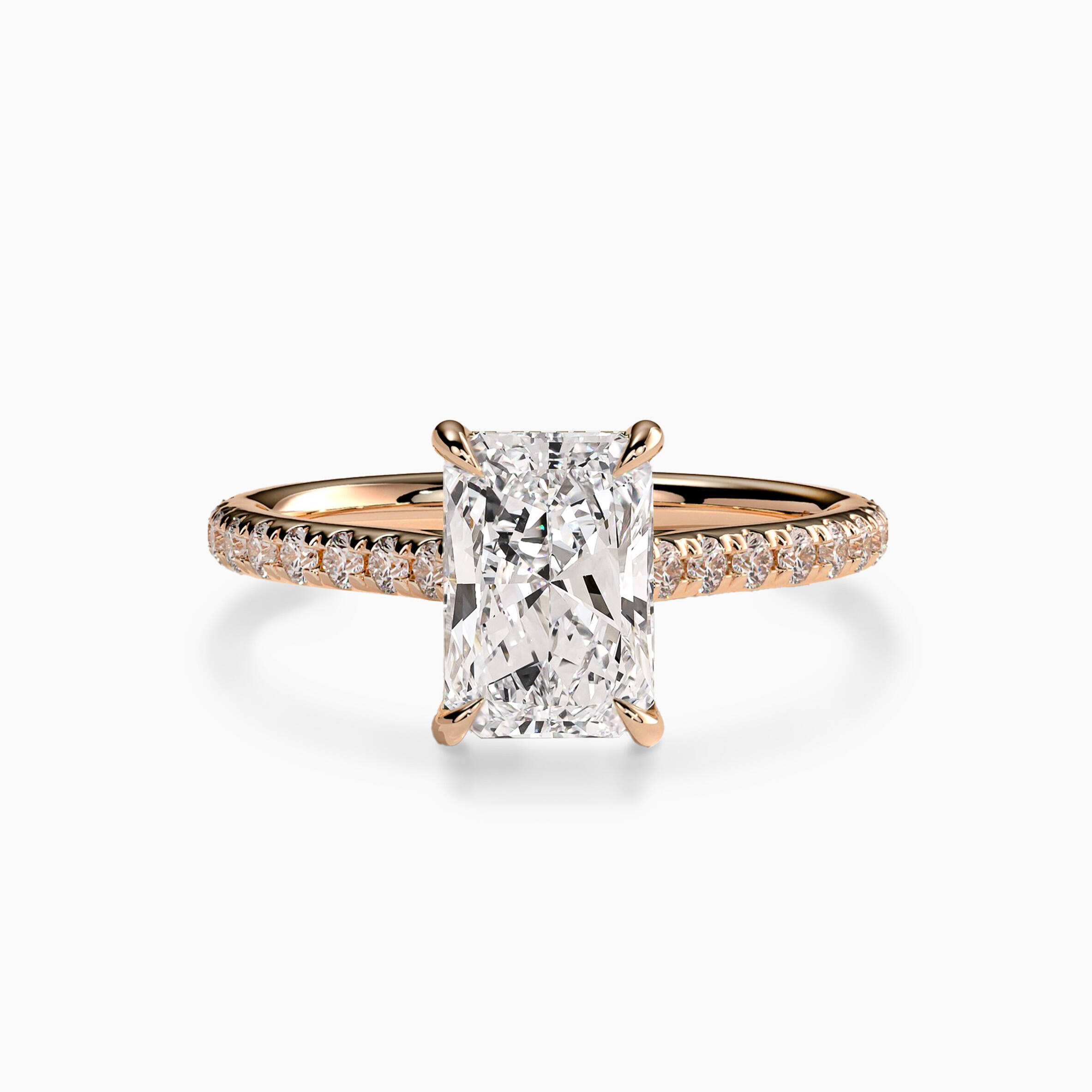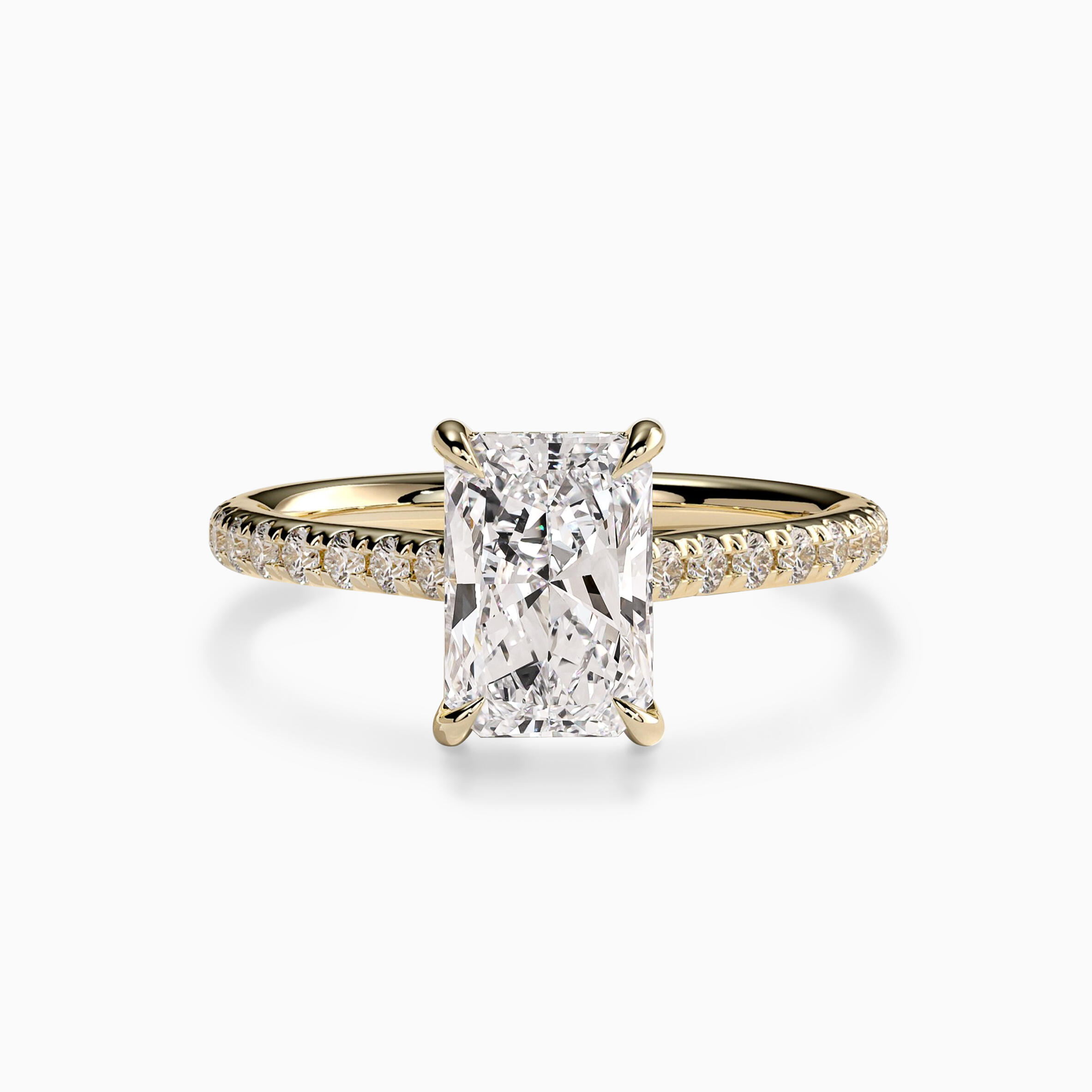 This striking radiant-cut ring features a brilliant lab-grown diamond and a shimmering pavé band. A delicate hidden halo adds a secret glow, making it a timeless tribute to a love that shines from within.