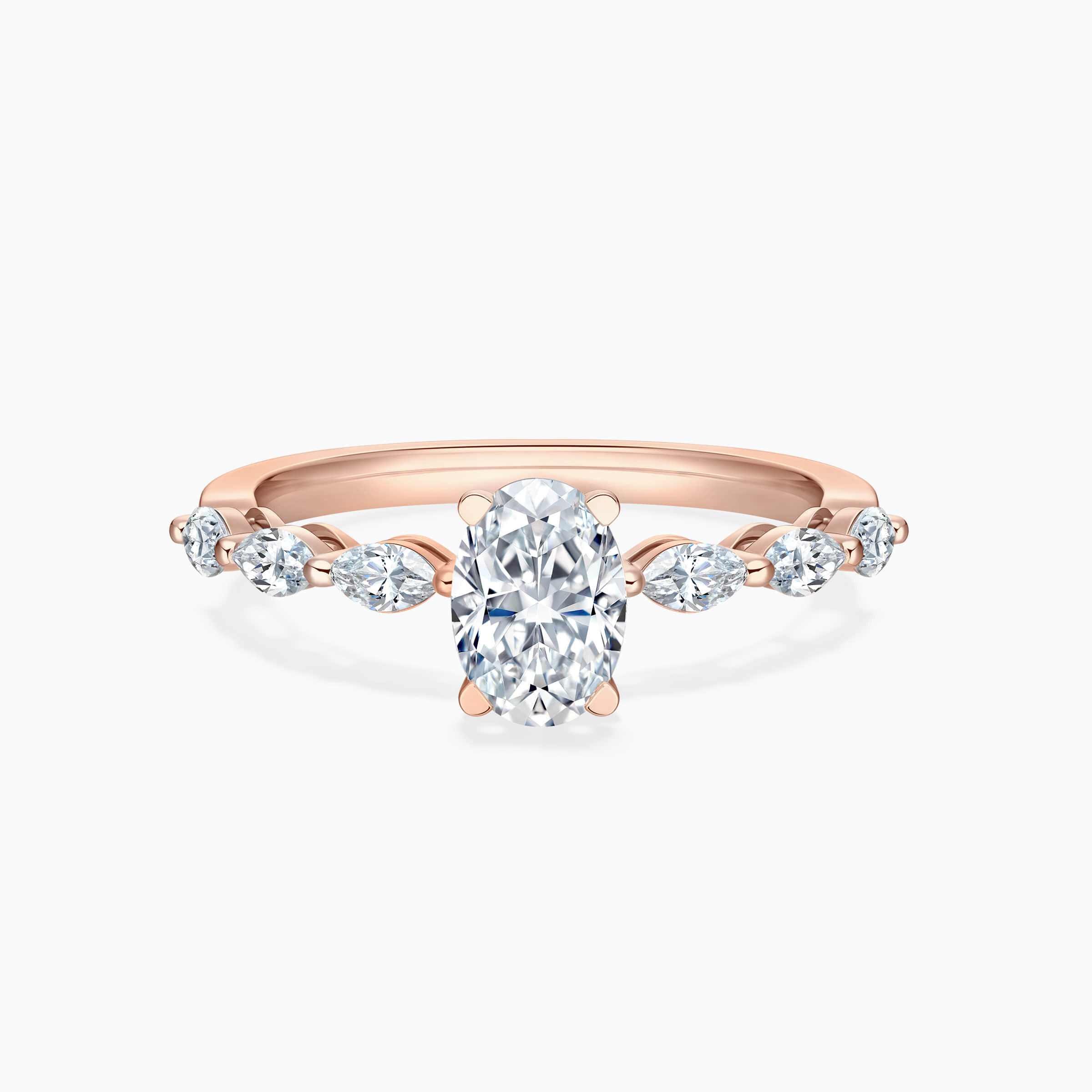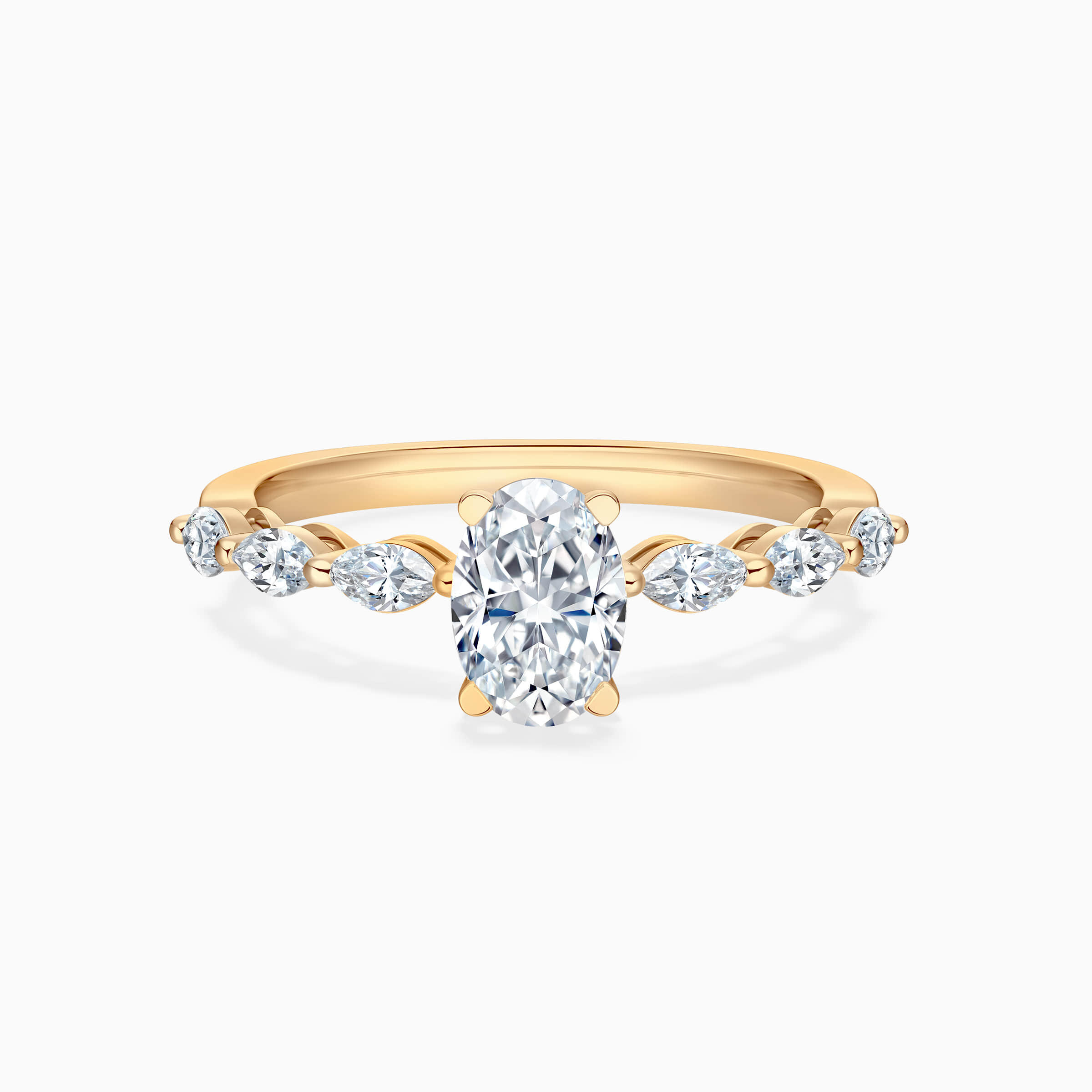 This exquisite ring features a brilliant oval-cut lab-grown diamond set on an alternating marquise and round band, designed to flatter and elongate the hand. With its rhythmic sparkle and unrivaled elegance, it is a radiant promise of a lifetime together — as rare and luminous as the bond you share.